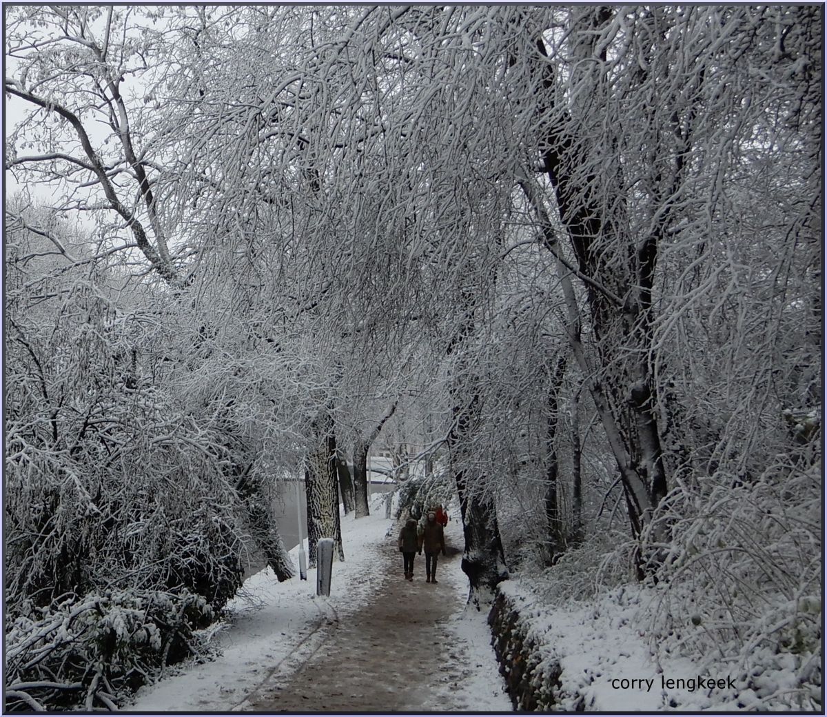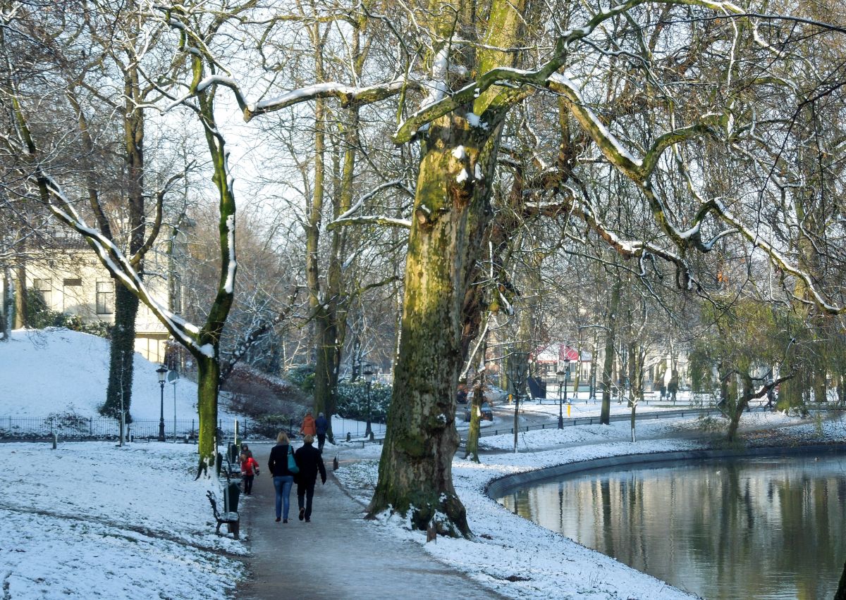 Wandelaars in besneeuwd Zocherpark op 10 december 2017