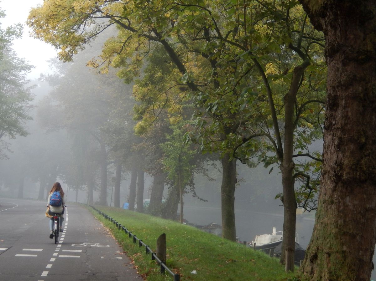 Fietser langs de oostzijde van een mistige Utrechtse singel