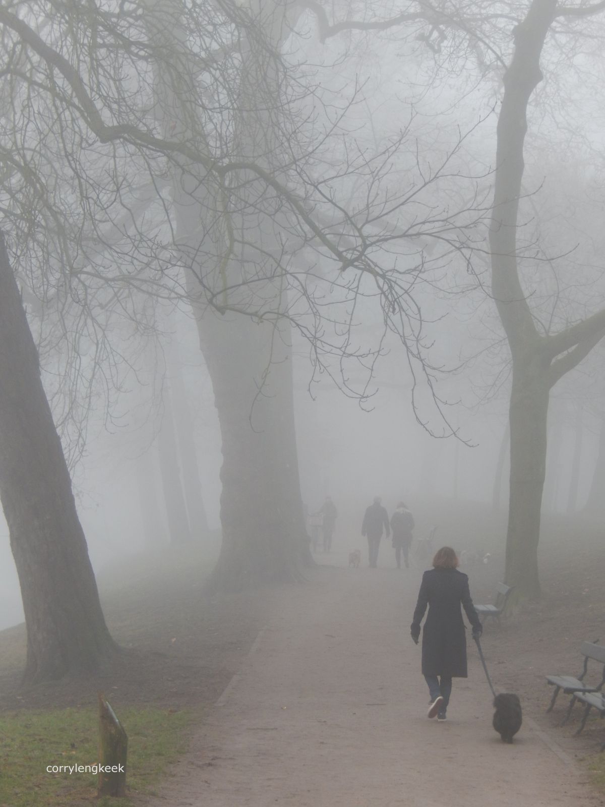 Wandelaars in mistig Zocherpark op 24 januari 2017