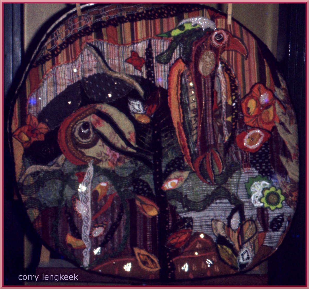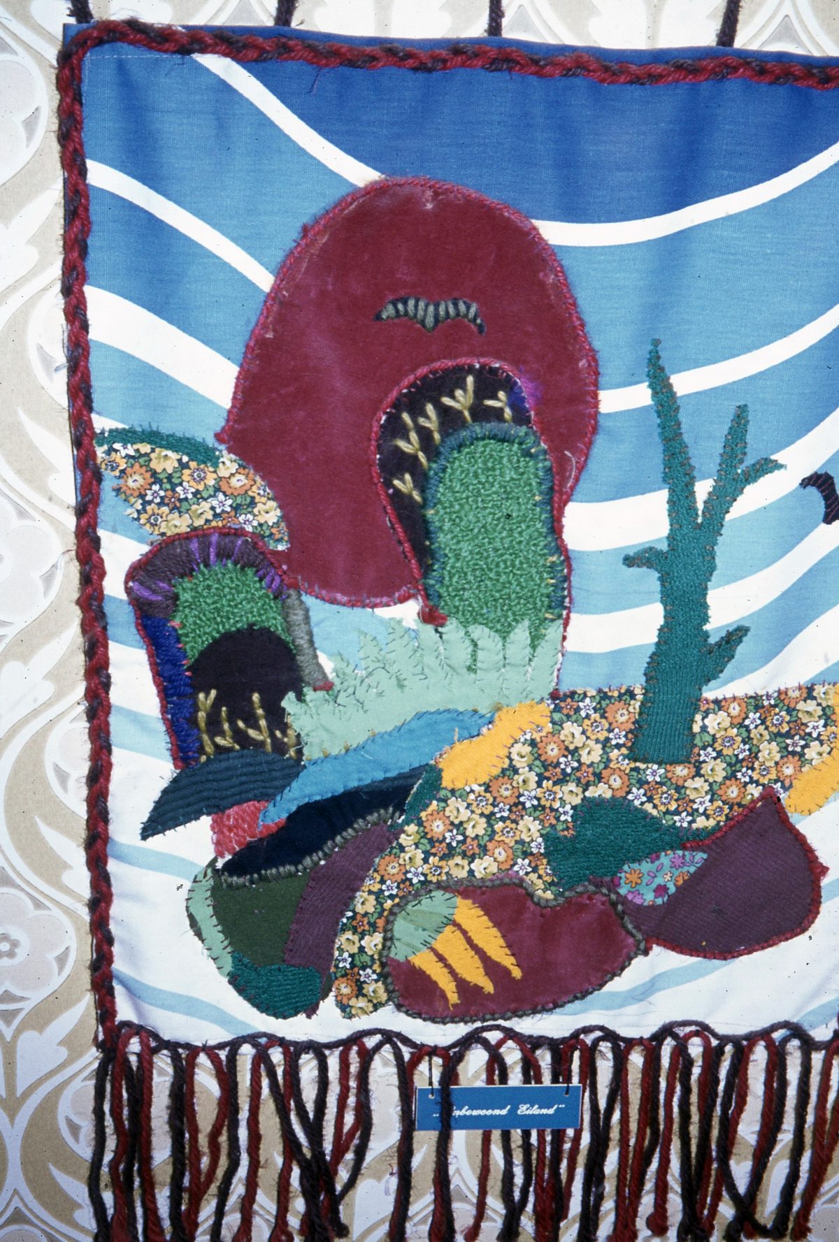 Dit “straatjeswandkleedje” is vervaardigd van overgebleven lapjes stof en aangevuld met verf en vetkrijt. |