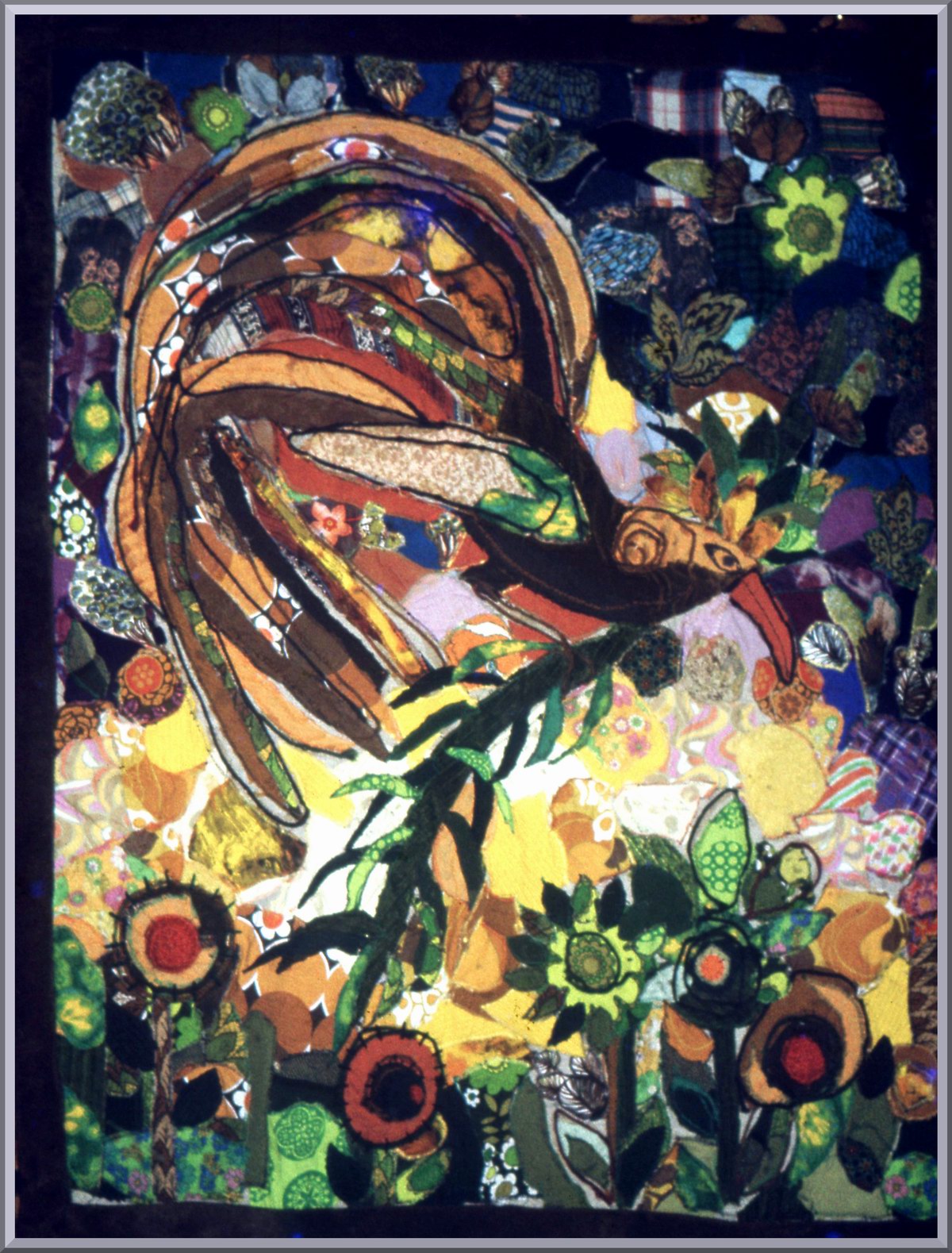 Dit “straatjeswandkleedje” is vervaardigd van overgebleven lapjes stof en aangevuld met verf en vetkrijt.